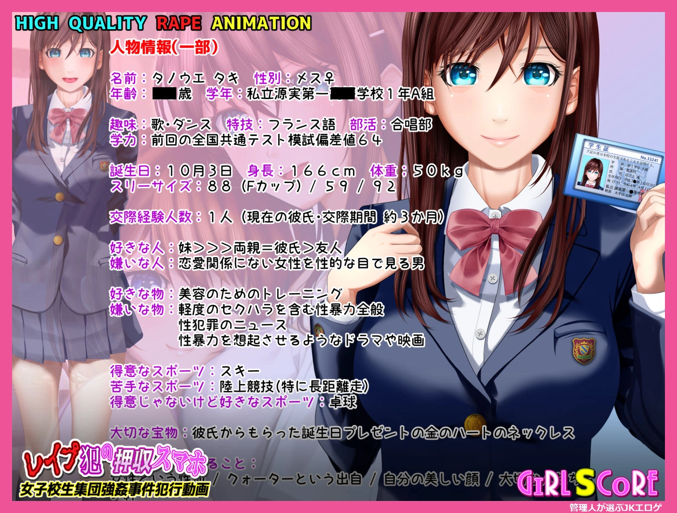 ジャンル 3DCG,動画・アニメーション,制服,学園もの,巨乳,寝取り・寝取られ・NTR,中出し,フェラ,シミュレーション,おっぱい,男性向け,成人向け,学生,旧作