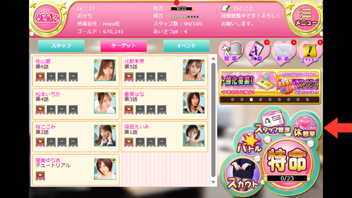 - スカウトして女性社員のカードを手に入れよう