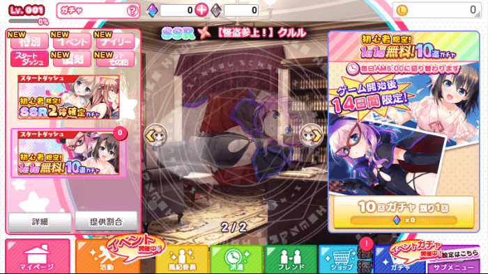 初心者限定キャンペーンとして、ゲーム開始後14日間は10連ガチャが無料で回せます!