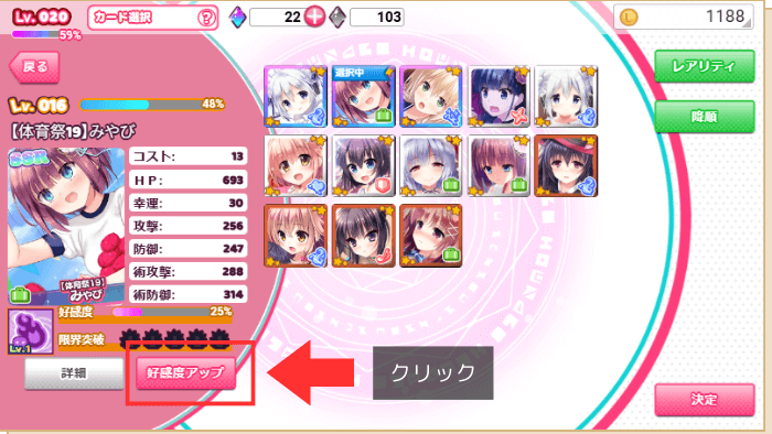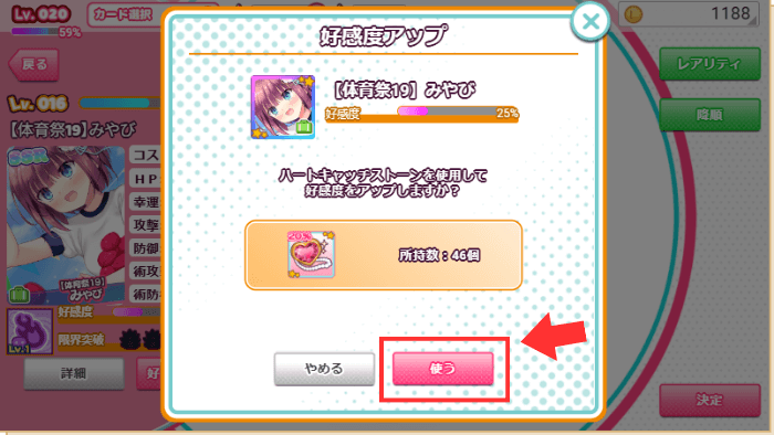 HR以上(HR・SR・SSR)のキャラをクエストで編成に組み込んだり、専用アイテム「ハートキャッチストーン」のプレゼントをしたりして好感度を上げましょう。