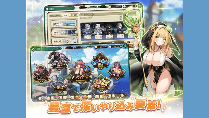 剣と魔法のファンタジー世界を舞台に、プレイヤーは「魔王軍」や「敵勢力」と戦う指揮官となり、巨乳ヒロインたちを仲間にして育成・編成しながら戦うRPGです。
