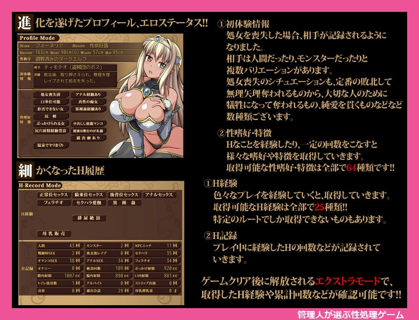 | ジャンル | 音声付き,辱め,ふたなり,触手,熟女,巨乳,アナル,ロールプレイング,機械姦,搾乳,男性向け,成人向け,連続絶頂 |
