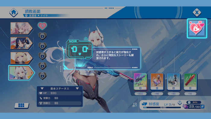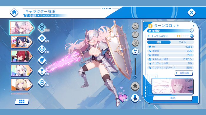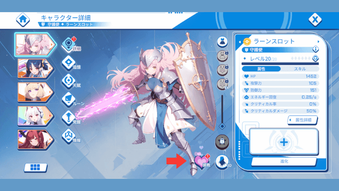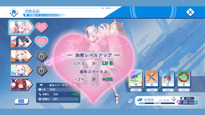 レベル・追憶・天賦・ルーン・覚醒・好感度(調教)など、育成メニューが非常に豊富です。